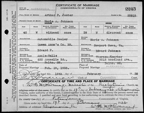 According to the marriage license, there were married in Alexandria, Virginia on the 19th of February 1938. Her full name is Marie Antoinette Johnson.